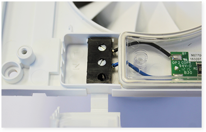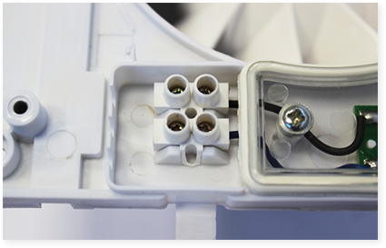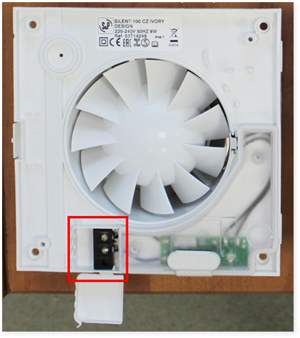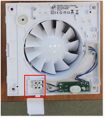 1. При демонтаже всей цветной части, видны элементы подключения электропроводки. У оригинального вентилятора Silent 100 CZ Design Ivory клеммная колодка с зажимами типа площадка. Все вентиляторы серии Silent и Silent Design имеют такой вид клеммной колодки.