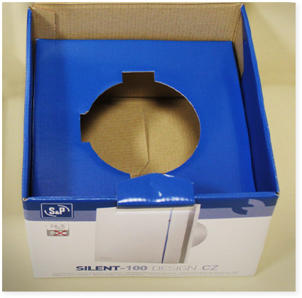 Вентилятор упакован в похожую на оригинальную упаковку Soler&Palau - коробки имеют маркировку и серийные номера одинаковые на всех контрафактных вентиляторах. Плохое качество полиграфии видно не вооруженным глазом, а именно блеклые краски, плохо читаемые шрифты. Даже картон другого качества, цвета, фактуры - более толстый (клееный, многослойный).